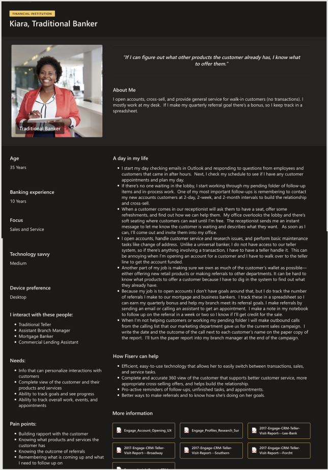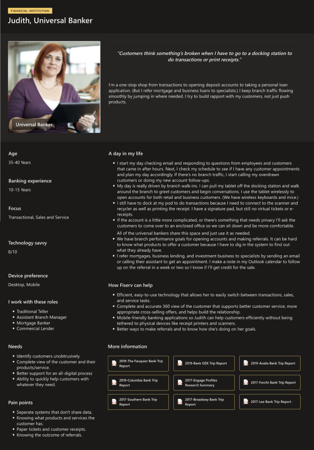 Who are we designing for? We had several banks that used the legacy version of Precision, so we created personas based on research from the employees. Multiple personas were needed to portray the different positions. We took typical jobs to be done, pain points, and needs of each position and used them to create our personas.
